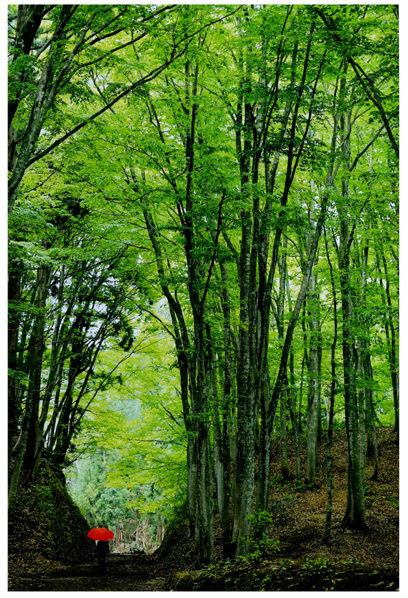 スラリと伸びたブナの新緑に赤い傘。新潟の有名な美人林の1枚です。濡れた木肌と赤い傘の落ち着いたコントラストが印象的です。また、モデルの奥様への思いが感じられる作品です。