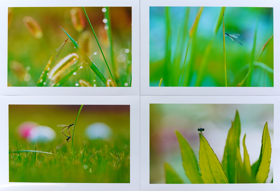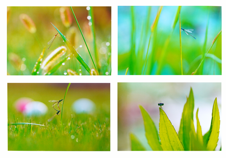 夏の早朝のイトトンボを捉えた組み写真です。細くはかない感じのイトトンボですが、大きな目でこちらをじっと見つめる右下の1枚は存在感を感じさせてくれますね。