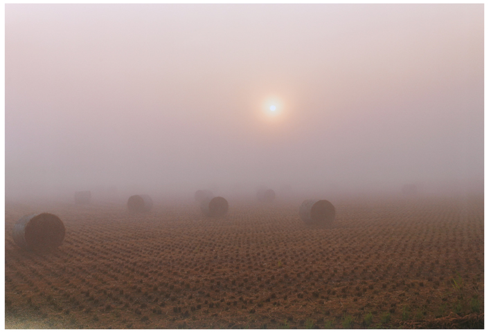 これも稲わらロールですが、こちらは朝もやにつつまれて幻想的な情景です。もう一つ何かがあるといいなぁとも思いますが。。殺風景的な静寂もいいのかもしれません。