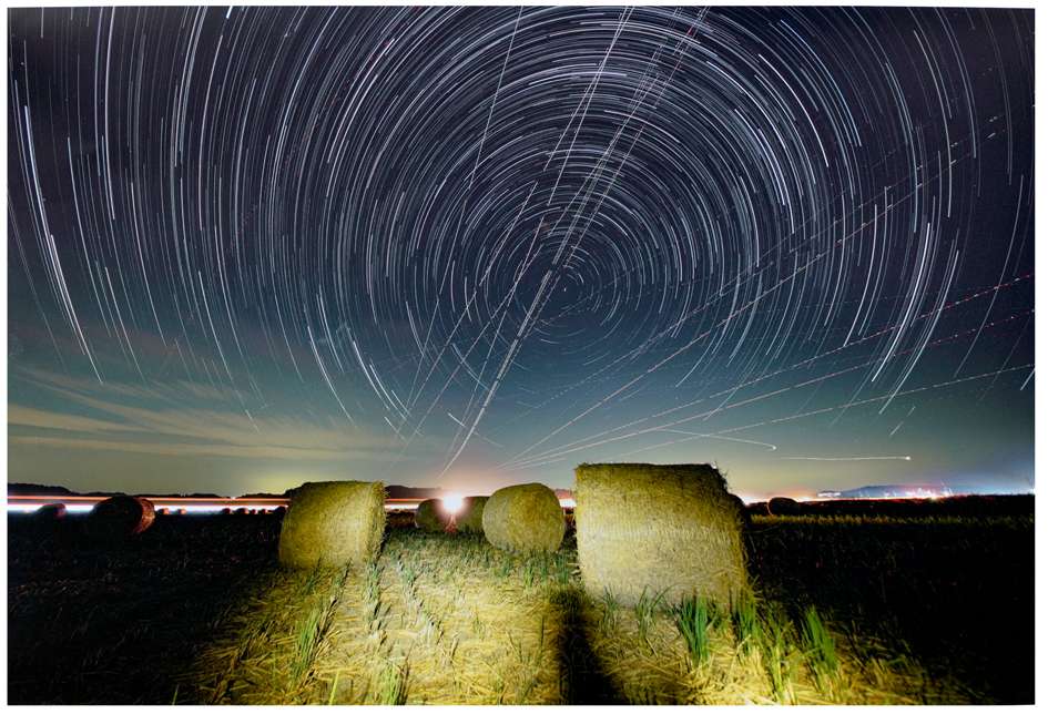 これは、菅澤さんの協力が無ければ生まれない作品でした。稲わらもロールですが、夜空の星もロールです。これは600枚を比較明合成した結果の作品です。と、下側の