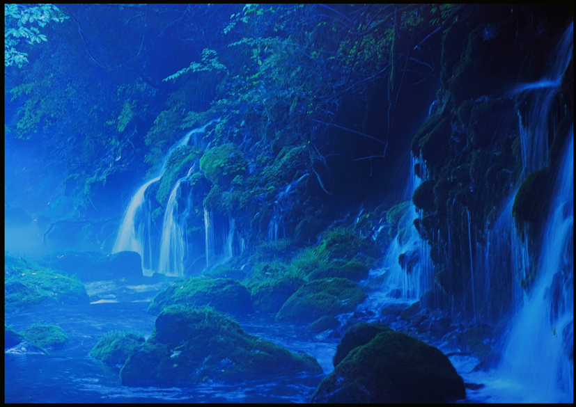 青くもやる渓流。糸のような滝が白く渓流を飾っています。夜明け前の青い光が目覚めぬ森の空気を写してるかのようで、神秘を感じます。