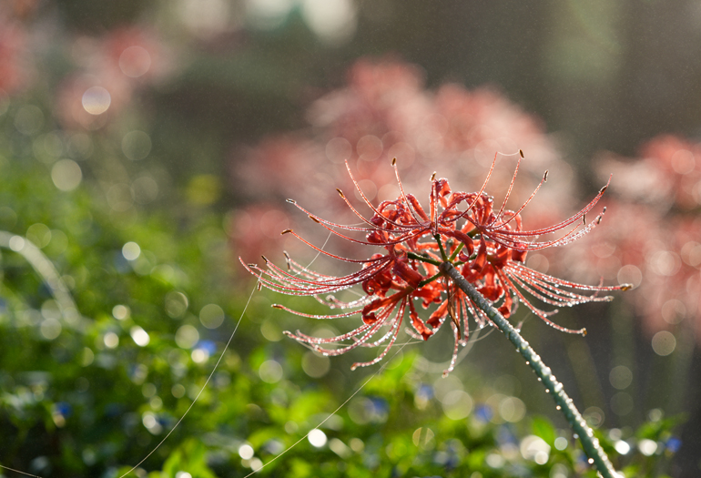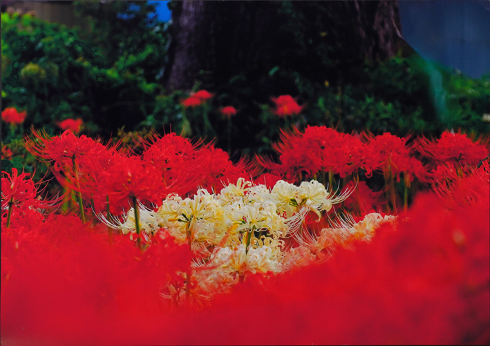 真っ赤な中に白い彼岸花。華やかな光景です。後ろには大きな樹が鎮座して共演しているかのよです。または、お年寄りをいたわる孫のような彼岸花でしょうか。