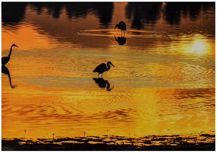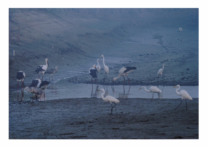 先月に引き続きコウノトリです。今回は、朝もやの中でエサ取り。 サギと一緒になってなかなか見られない光景ですね。