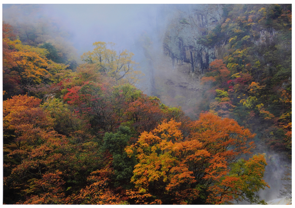 紅葉の渓谷でしょうか。霧がただよというより沸いているというようです。彩り豊かな木々の葉を白の霧が覆って、幻想的な風景を作っています。