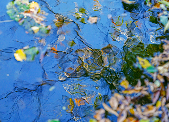 あけぼの山公園の池に広がる落ち葉たち。蓮の枯れ葉にくっついて、終わりゆく秋を