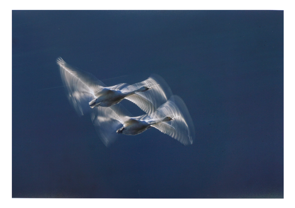 スローシャッターで捉えた白鳥の羽ばたきのラインがあさの光を浴びて、美しいです。