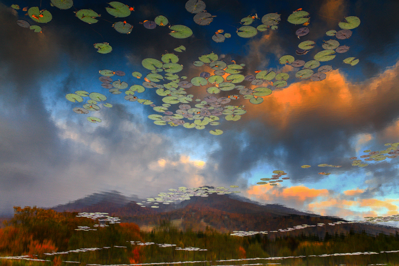 沼に映りこんだ青空とオレンジの雲。ヒツジ草が紅葉の山を飾ります。