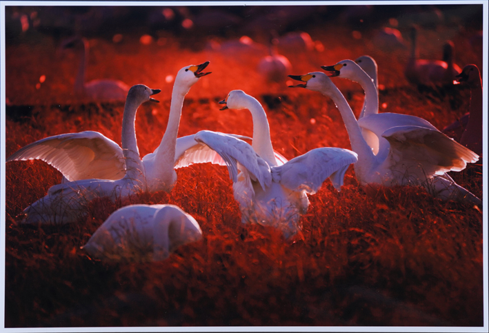 夕やけの陽だまりの中に集まる白鳥たち。「みんな集まって~」と言っていたんですね。前回もこれと同じような作品でしたが、今回は、白鳥たちのおしゃべりが聞こえるようでとてもユーモラスで、また赤と白のコントラストも美しく、素敵な作品になったと思います。