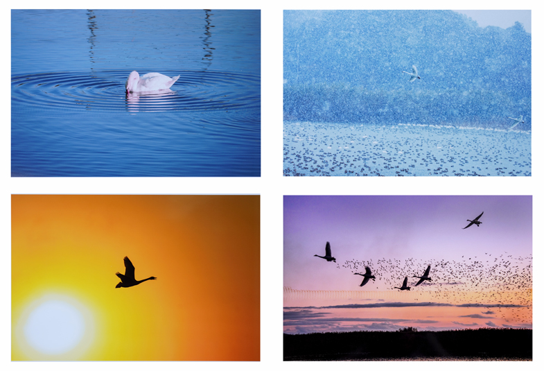 4枚の白鳥の組み写真です。夕暮れを飛ぶもの、雪の中を飛ぶもの。色々撮れるものですね。近くの夏目の堰に白鳥たちがやって来てくれるのも撮影の条件としては、かなりいいですね。