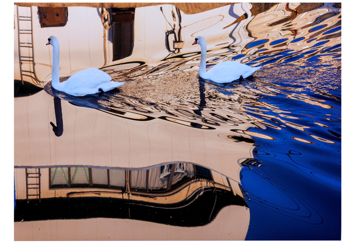 黒部川を優雅に散歩中の白鳥。水面に映る美しい模様は、静寂な朝の贈り物。 見事な作品です。